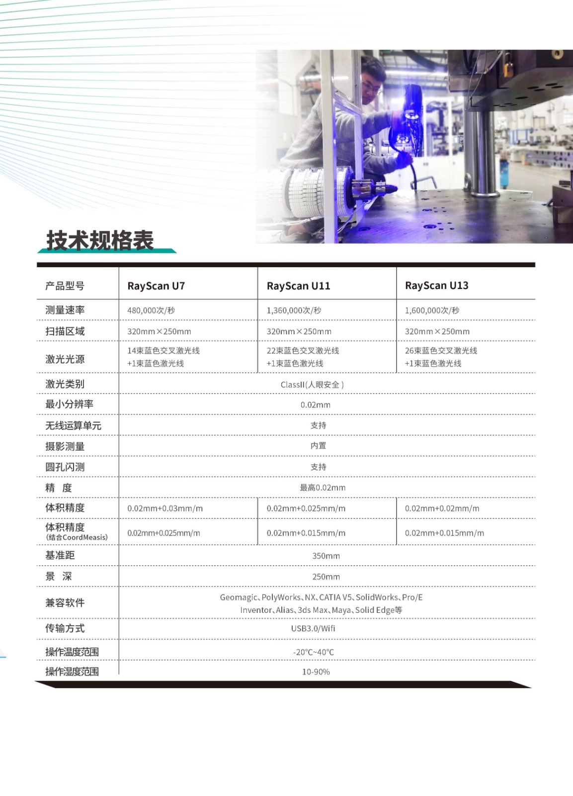 產品型號:非凡士3D掃描儀RayScan系列包括RayScanU7、RayScanU11和RayScanU13三個型號。每個型號的測量速率和掃描區域都有所不同,用戶可以根據自己的需求選擇適合自己的型號。