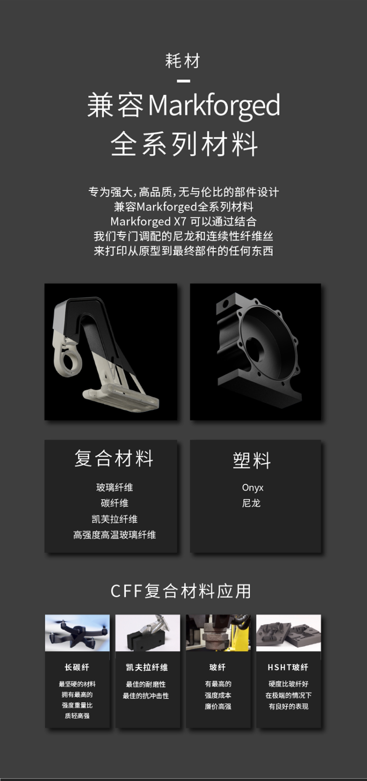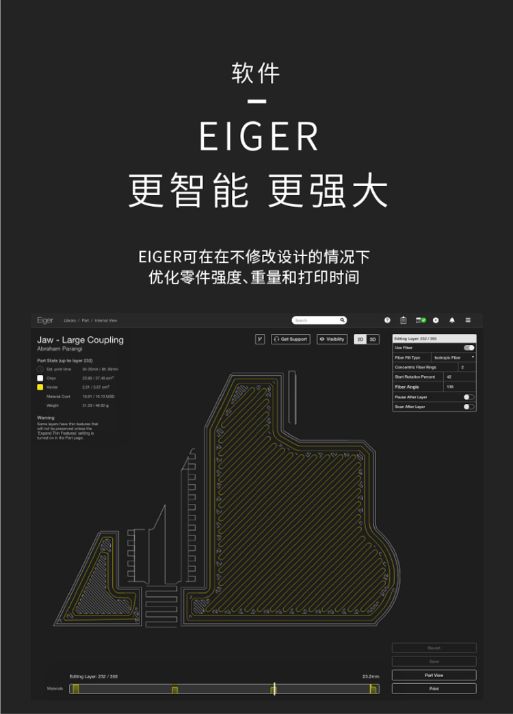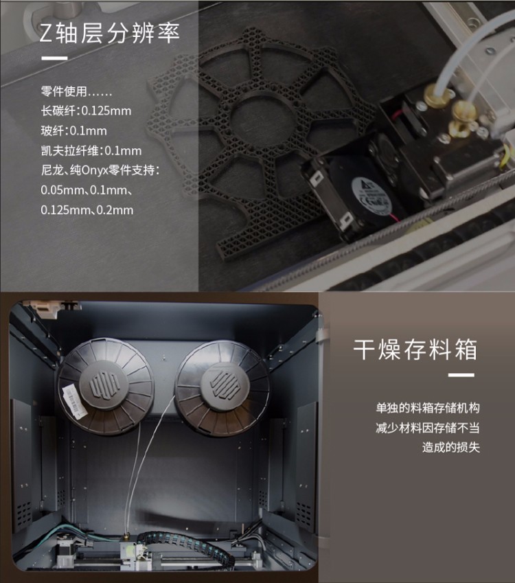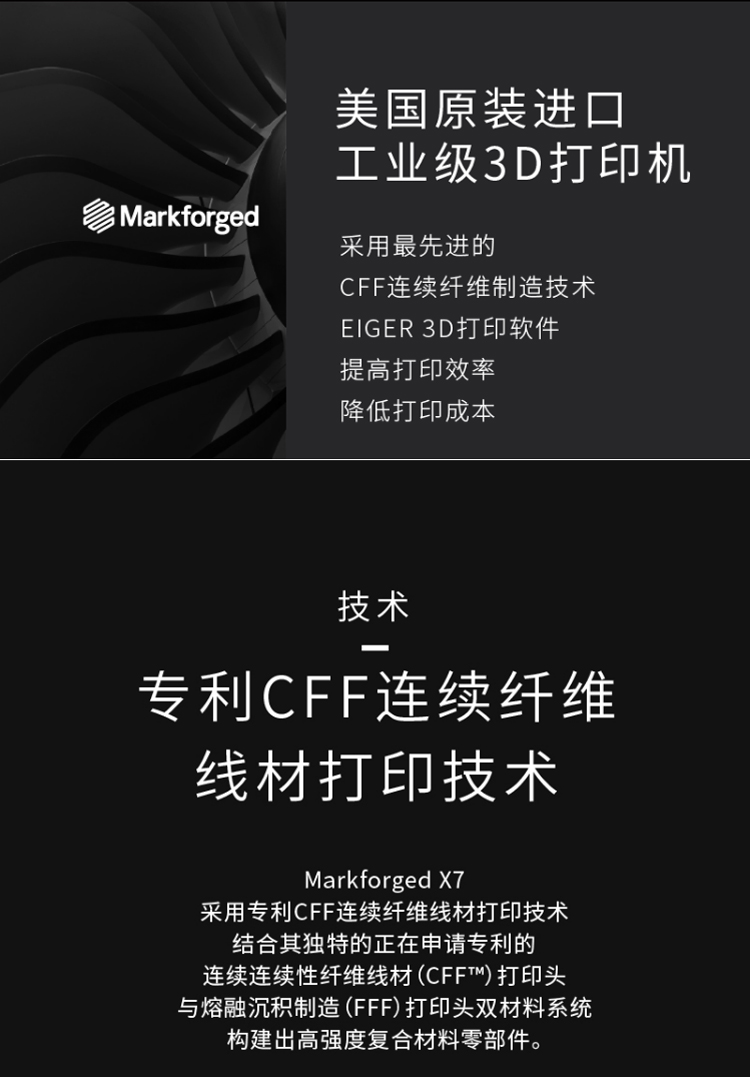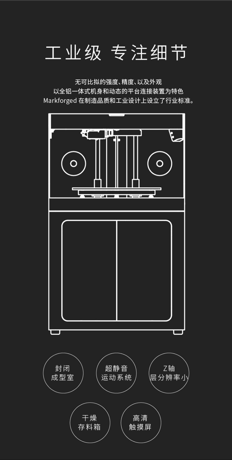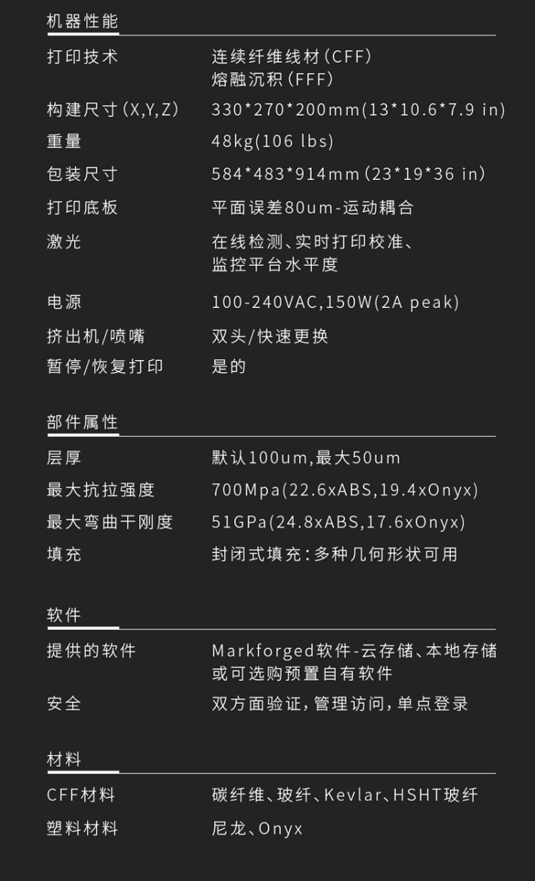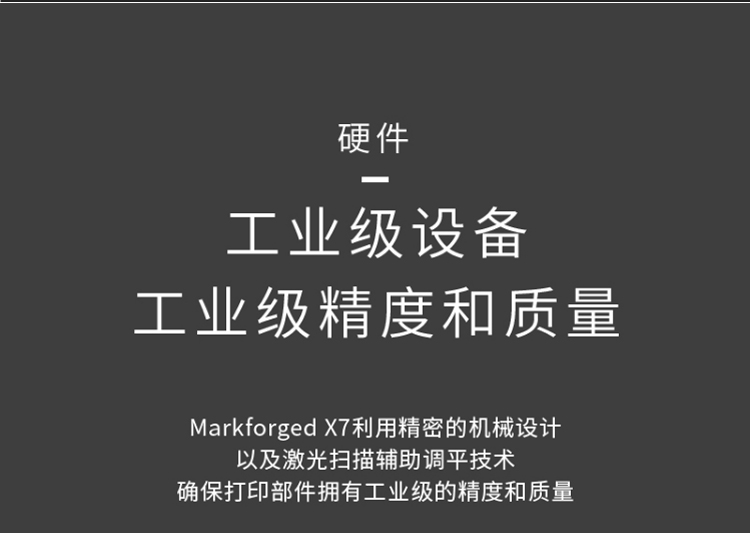 Markforged X7是一款基于復合材料的3D打印機,它采用了Markforged自主研發的獨特技術,可以在同一設備上打印出強度高、精度高、耐熱、耐腐蝕等性能優異的零部件。它是一款專業級3D打印機,主要應用于航空航天、汽車、醫療器械等領域。Markforged X7的打印材料主要包括了碳纖維、玻璃纖維、金屬、Kevlar等多種材料,這些材料都具有高強度、高剛度、高耐熱、高耐腐蝕等特點,可以滿足不同行業的需求。此外,該打印機還支持金屬增強復合材料打印,可以打印出具有金屬質感的零部件,增加了產品的美觀性和實用性。Markforged X7采用了全新的雙頭打印技術,可以同時打印出纖維增強和金屬材料,實現了更高的打印速度和更廣泛的應用范圍。同時,該打印機還配備了自動校準和自動切換打印頭等功能,可以大大提高打印效率和穩定性。Markforged X7還支持云端管理和遠程監控,可以隨時隨地掌握打印進度和狀態,大大方便了用戶的使用和維護。該打印機還具有高度的可定制性,用戶可以根據自己的需求進行定制,實現個性化的打印需求。Markforged X7是一款功能強大、性能優異的3D打印機,具有高度的可定制性和適用性,可以滿足不同行業的需求,為用戶提供高效、精準的打印解決方案。